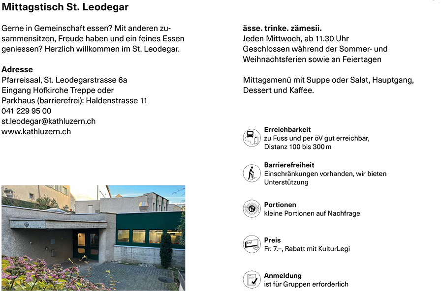 Hier läuft alles wie am Schnürchen, also eingespielt bis ins Detail. Jeden Mittwoch wird im Pfarreisaal St. Leodegar von Freiwilligen ein 3-Gang-Menü gekocht und serviert – für 7 Franken, Espresso und Herzlichkeit inklusive. Der bunte Salat mit Mozzarella-Kügelchen, die reichhaltige Gerstensuppe mit Würstchen und die erfrischende Zitronencreme haben hervorragend geschmeckt.
