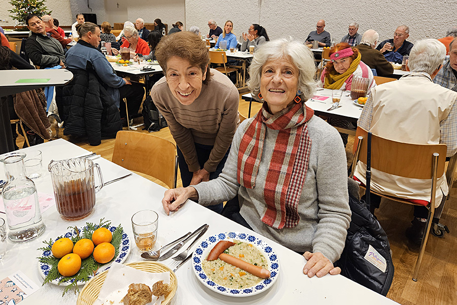 Der Saal war bis auf den letzten Platz besetzt. Neben uns sassen drei Menschen, die regelmässig öffentliche Mittagstische aufsuchen: Ein Mann aus der Ukraine, eine Frau aus Lettland, die heute in Littau lebt und mit Steinen aus der Emme verspannte Rücken therapiert, und eine schweigsame Schweizerin. Als die Gespräche richtig in Gang kamen, war leider schon Zeit um Aufbrechen – der Raum musste für einen 60plus-Samichlaus-Anlass vorbereitet werden. Kurz: In diesem Saal ist etwas los! (eho)
